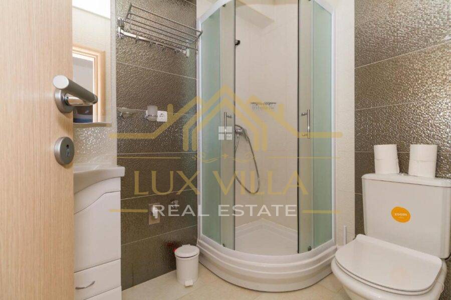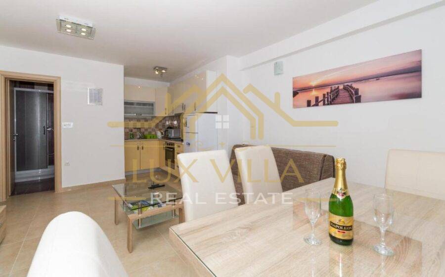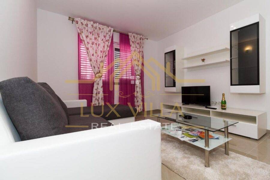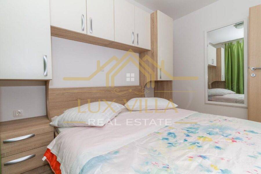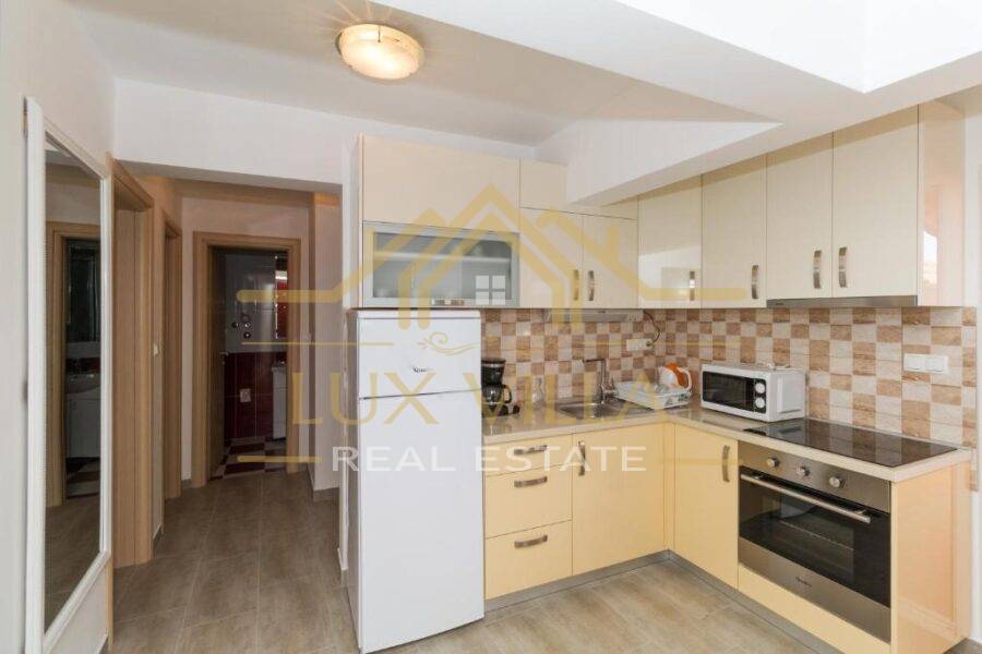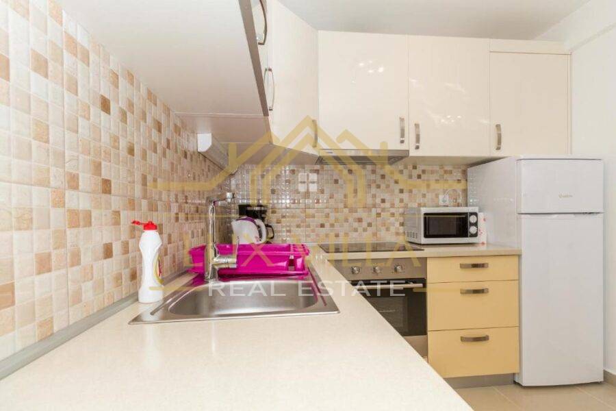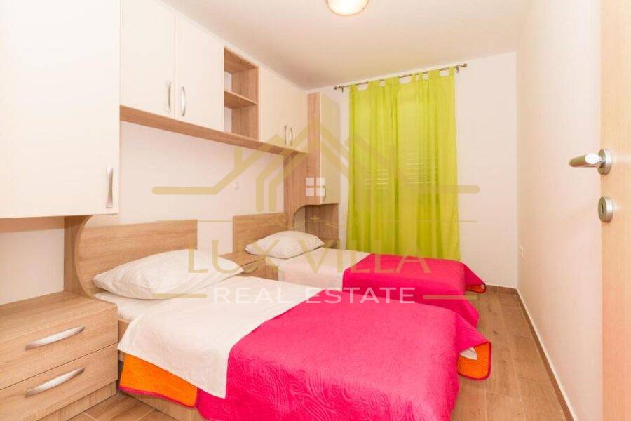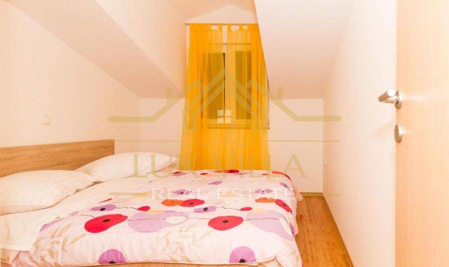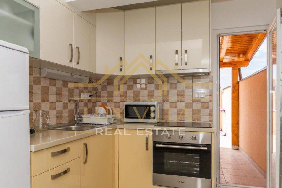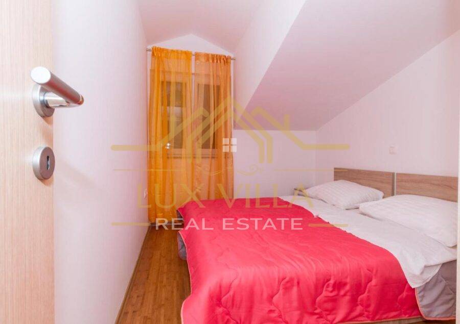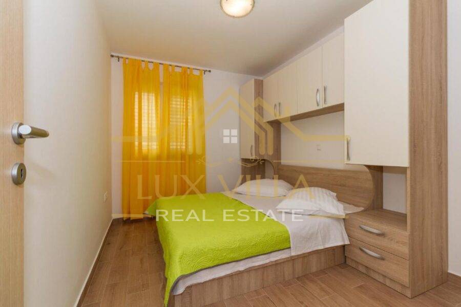 Two are one bedroom apartments and they consist of a kitchen with a dining room, a living room, a bathroom and a bedroom. Then two two bedroom apartments of the same layout with kitchen and dining room, living room, bathroom and two bedrooms. On the top floor is the largest apartment, which consists of a kitchen with a dining room, a living room, a bathroom, three bedrooms and a terrace with a beautiful view of the sea and the whole town.
